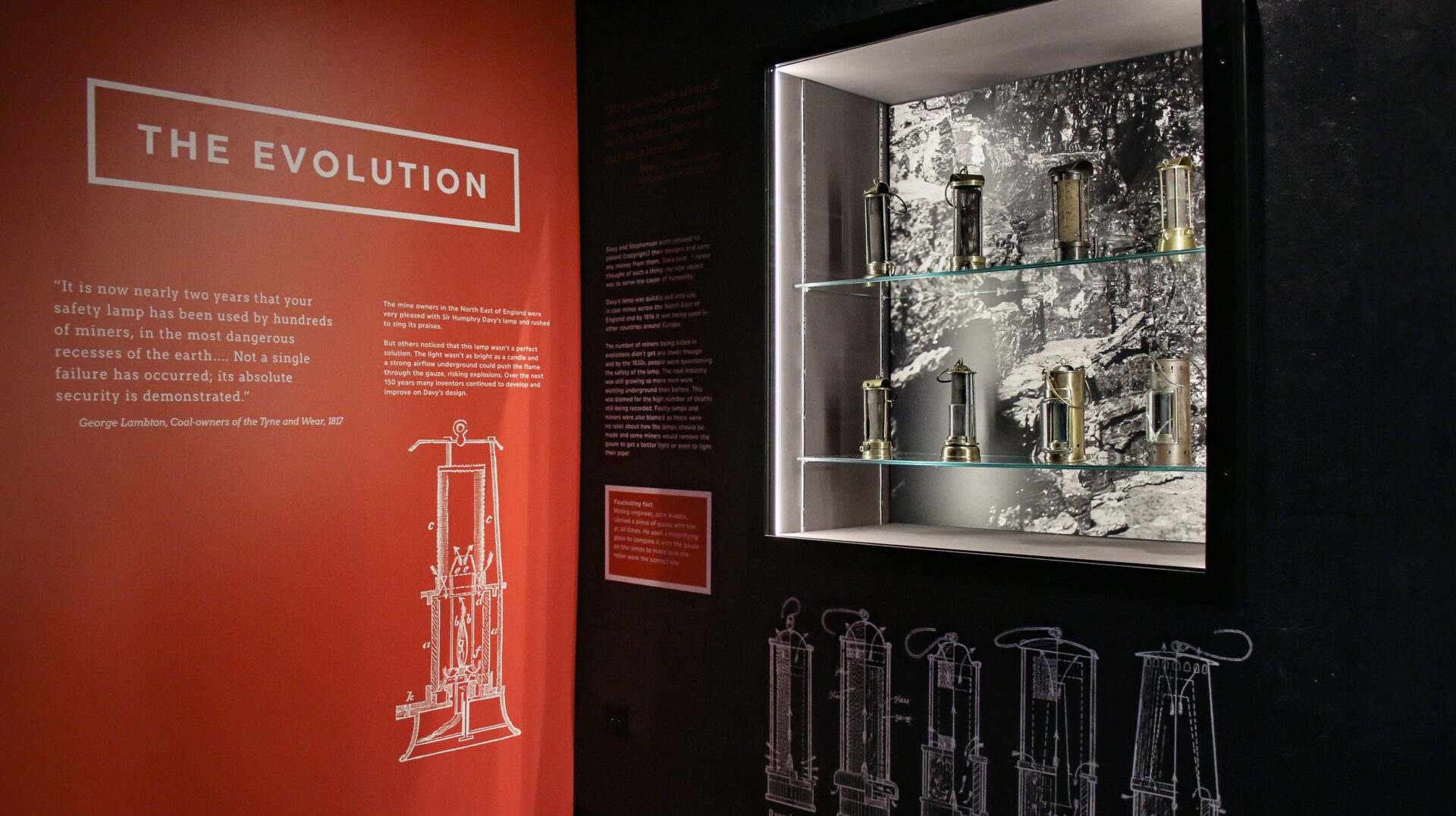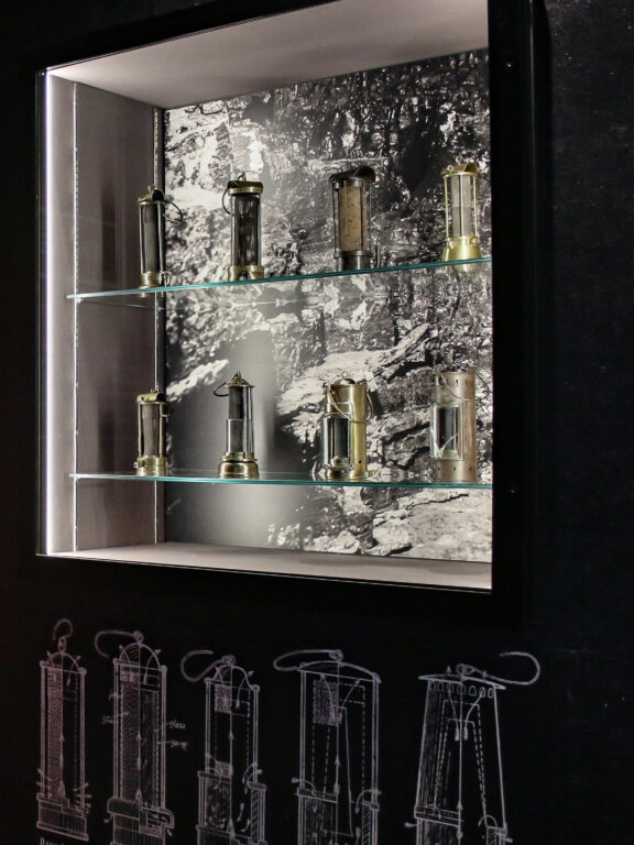 To put a spotlight on the exhibition’s key object, Davy’s Flame Safety lamp, we encased it in its own giant lamp setwork inspired by Davy’s initial lamp designs. The Evolution Wall features a beautiful mass display of mining lamps, all inspired and evolved from the Flame Safety lamp designed by Sir Humphry Davy.